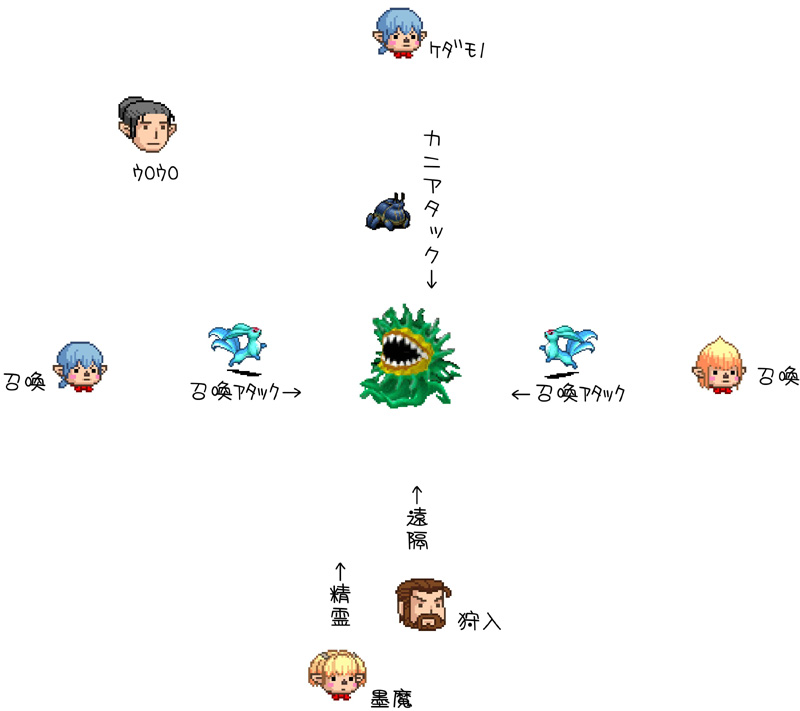 メリがタゲを取って「生臭い息」を避ける為に逃げる→逃げると召喚獣の攻撃がミスるっと。