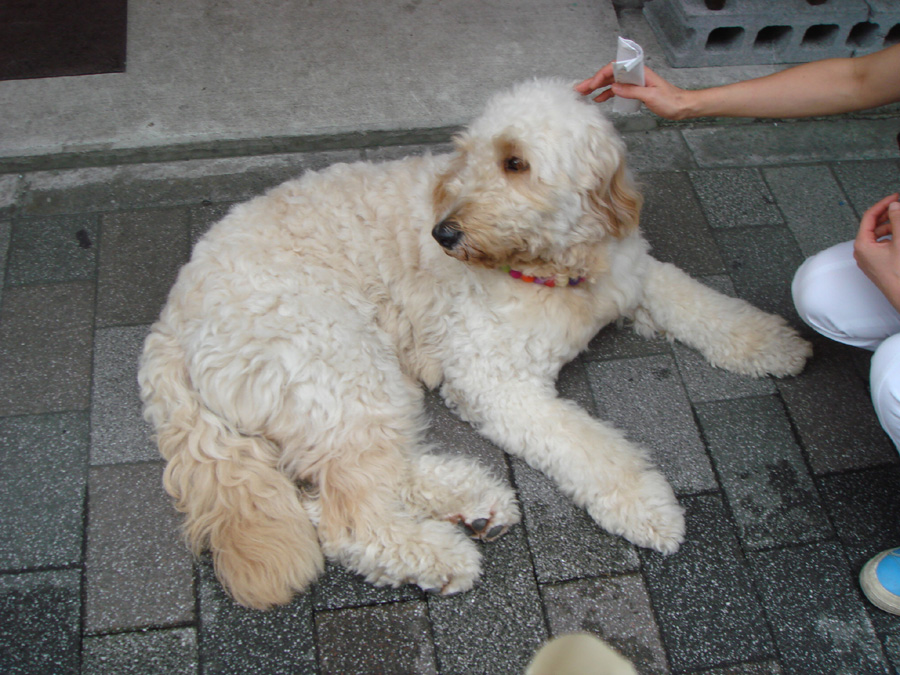お店の前でダレてた大きなワンコ。レトリバーと何か(忘れた)の掛け合わせとか。
