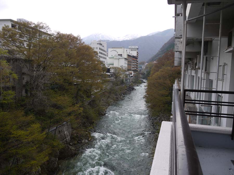 部屋のベランダからは綺麗な川が見え、遠くには雪化粧の谷川連峰が。