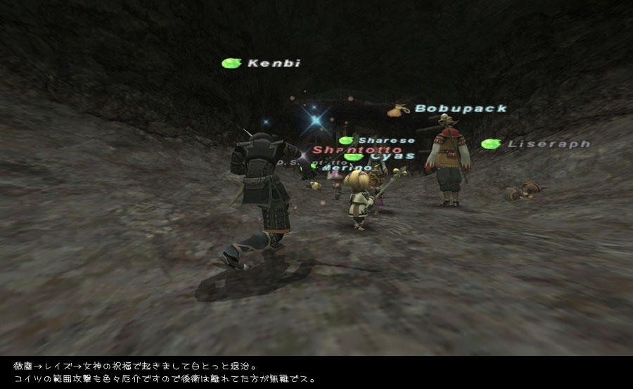 1人づつ順番に倒されて全滅。衰弱無しのリレイズがありますから起きて回復待ち。
