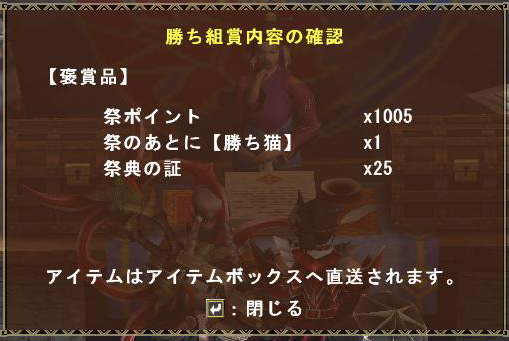 祭ポイントは猟団員全員で割られるので活躍してない私が貰うのは何だか申し訳ない感じ。