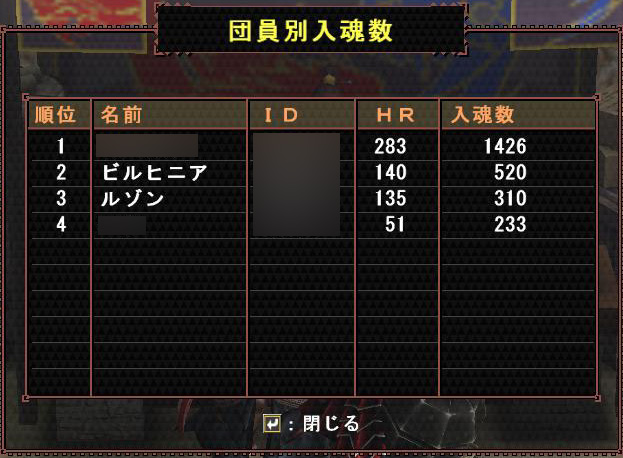 入魂数(頑張った証?w)の多い猟団TOP100が発表になりましたけど4人じゃ無理ですヨ。