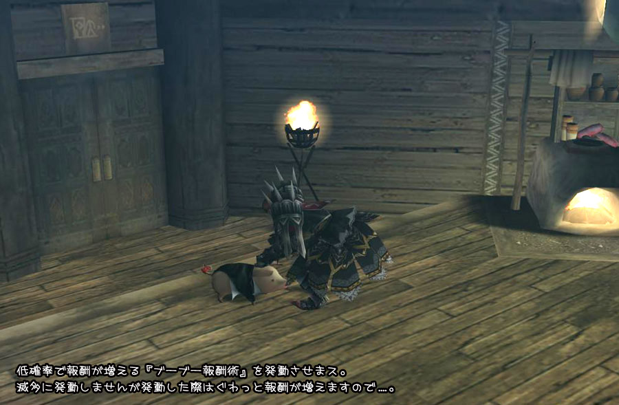 最後は猟団部屋へと行きまして、豚に餌をあげて「ブーブー報酬術」を発動させまス。